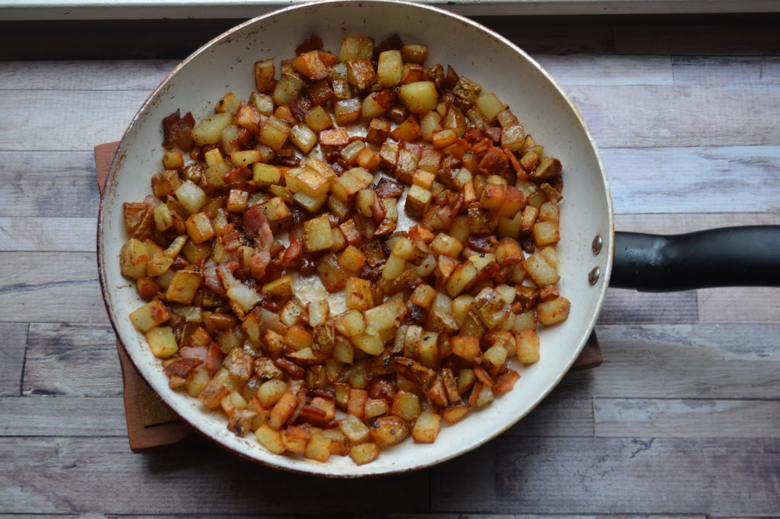 - Add the diced bacon to the potatoes. The bacon will start to render and the fat will begin to further cook the potatoes. Stir frequently, allowing the bacon to render and crisp (approximately 6 minutes).